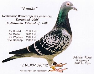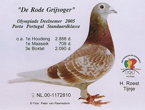NL 00-1172810 („De Rode Grijsoger“) kommt aus dem „de Bruinoger“, einem Sohn der „1. Astaube Mittelstrecke 1991“ in der Abteilung (etwa 2000 Mitglieder), und einer original Jos de Klak-Täubin. Die „De Rode Grijsoger“ flog bisher insgesamt 37 Preise. Ihre schönsten Preise entnehmen Sie bitte ihrem Foto! | ||